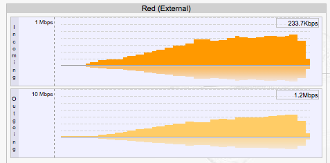 Armed with this revelation, I ran the rush again, this time while logged into bigdino’s Smoothwall Linux firewall & router, and as the rush unfolded, I watched the outbound network traffic climb and climb, soaring past my Comcast Business Class connection’s 2Mbps upload limit and flutter valiantly at 5Mbps for several seconds before collapsing in exhaustion at the end of the test: