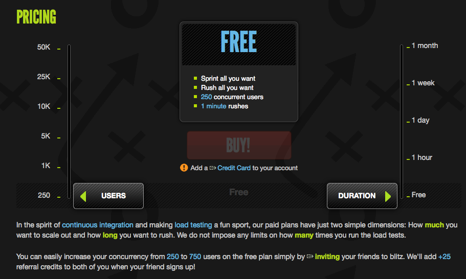 Blitz.io offers an entire series of test regimes. For casual users like me, there is a free tier of services, enabling you to apply a load test (or “rush,” as they call it) of up to 250 concurrent users for up to 60 seconds. You’re allowed to perform rushes at the fee tier as often as you like, and the test is tracked in real time and the results are presented in an very clear and readable format. The number of concurrent connections can scale up to 50,000, with tests as long as 20 minutes; to “rush” any higher than the default tier, you need to pay. This makes sense, since rushes involve a substantial amount of horsepower and bandwidth which must be brought to bear; if you’re bringing a large commercial site online and need to see how it reacts under a monstrous load, the ability to engage Blitz.io to immediately test your site without having to coordinate a simulated test environment could be invaluable.