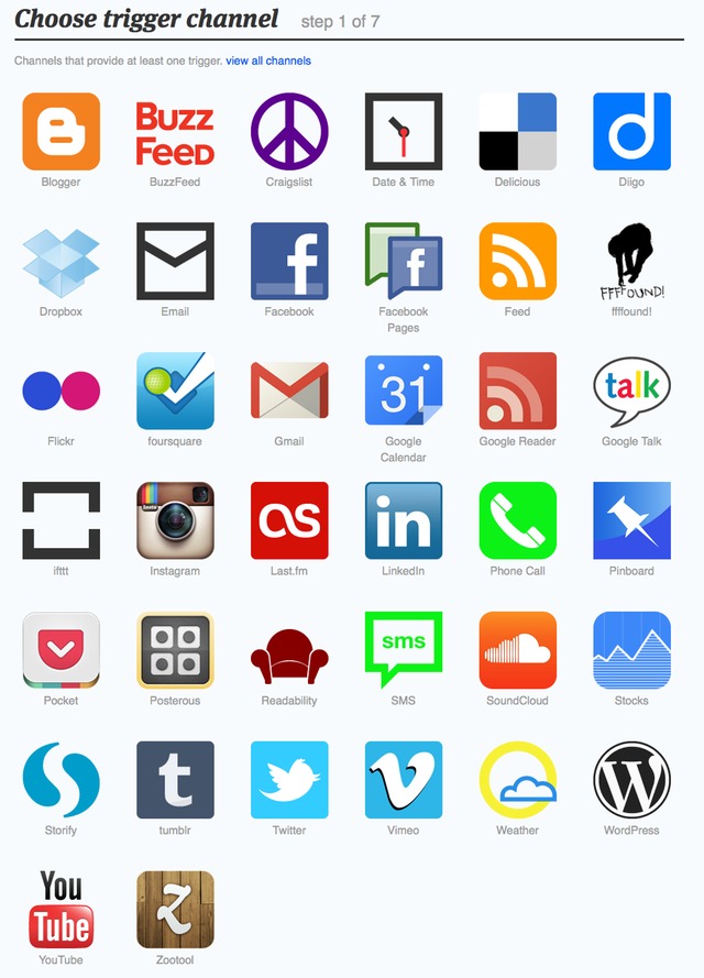 Click the large “THIS” link to define the type of trigger—the “this” part of “if this then that”. You’ll get a list of things you can pick from to cause your task to trigger: