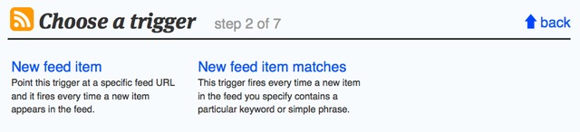 We want to use RSS events, so click “Feed”. Then, you set the conditions that apply to that trigger—that is, you tell the site what has to happen to the trigger to make it actually trigger. There are two options for RSS feeds: “New feed item”, where any new item in the feed will trigger the event, or “New feed item matches”, where only new items with specific keywords will trigger the event. We want the first one: