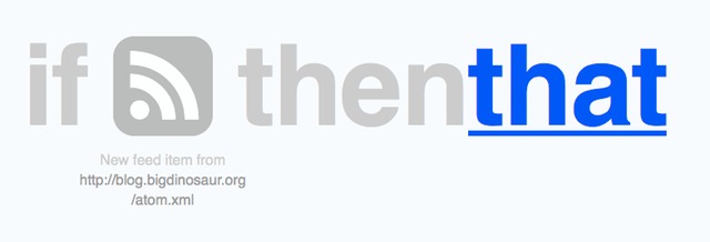 There are a huge range of triggers you can pick from and actions you can accomplish; the site gives lots of ready-made examples (which they call “recipes”)—automatically send yourself a text message if you’re tagged in a photo on Facebook, or automatically take anything you send to Instagram and archive it on Dropbox, and lots of other things. I was interested in using it to automatically tweet anything I post on the Bigdinosaur blog. There are recipes already created for if you have a Blogger or Wordpress blog, but Octopress doesn’t have the external hooks those other blogging engines do (or really any hooks, since Octopress is just a flat-file blog!), but Octopress does automatically update its RSS feed whenever you make a new post. Since you can create actions based on RSS feeds, we’re all set!