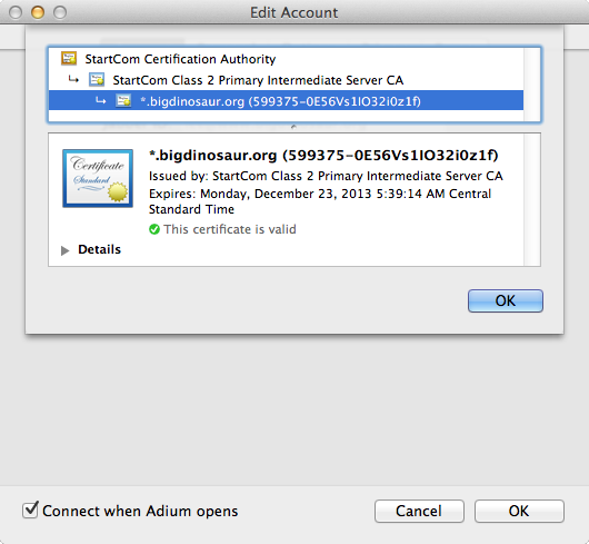 The last check, of course, is to connect to the server with your IM client using the SSL/TLS port, and then have your IM client retrieve the server’s certificate. This shouldn’t be a problem, since we’ve gotten this far already and Openfire shows everything working, but it’s always good to check: