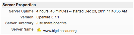 However, if everything appears as expected, go ahead and log on to the Openfire console. If you’re using a wildcard certificate, you might get a yellow caution splat by the server name on the Server Information tab: