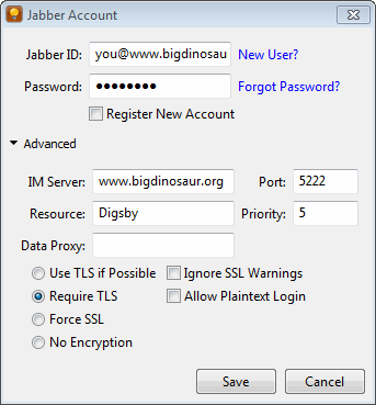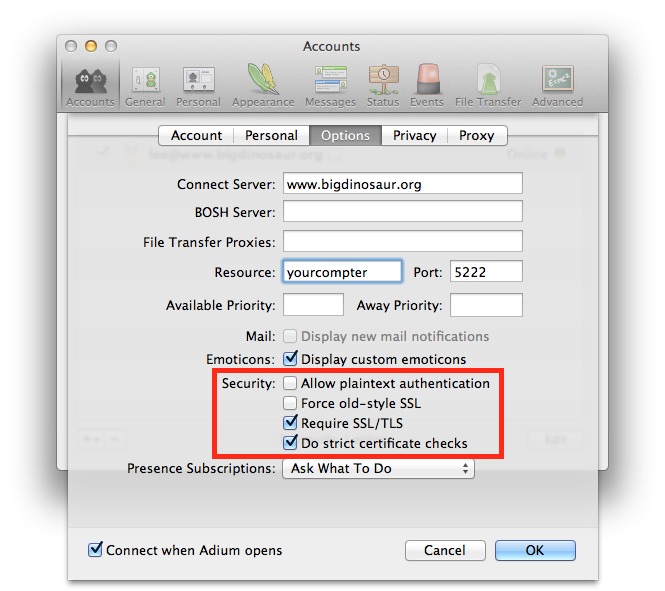 The last post on Openfire (discussing how to add SSL/TLS certificates) proved to be pretty popular, and I’ve gotten more than one request for a follow-on about securing Openfire clients—that is, forcing them to communicate with the Openfire server using only an ecrypted SSL/TLS connection rather than cleartext. In this post we’ll go through how to configure three popular IM applications to use SSL/TLS with Openfire. I’ll also add notes about how to enable OTR messaging encryption on two of those IM clients.