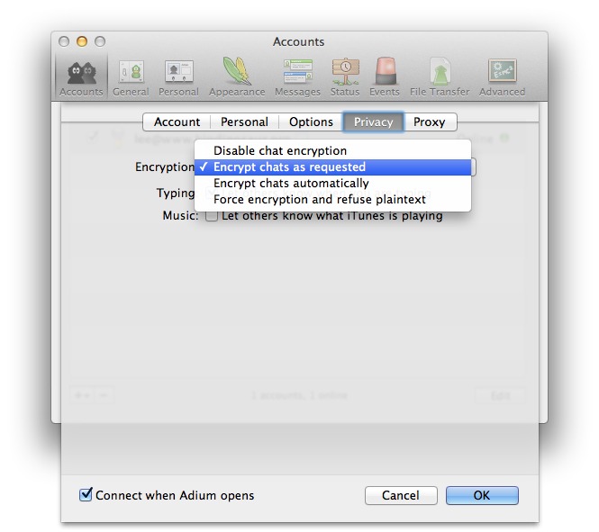 Some IM clients only support OTR encryption via an installable add-on; fortunately, Adium comes with OTR support already built-in. The configuration options for it are located in the Privacy tab under your account’s properties: