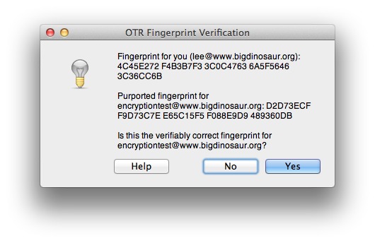 For clients with OTR Messaging enabled, you should perform a test converstation to ensure that encryption is functioning correctly. In the screenshot below (taken from Pidgin because it’s a bit more vocal about what’s going on) I’ve started a non-encrypted chat, then sent an encryption request, exchanged keys, and verified the key fingerprints.