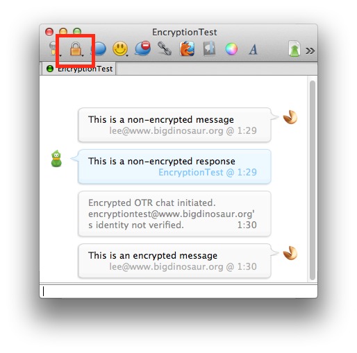 The process is much the same on Adium, with the encrypted chat initated by clicking the lock icon in the window’s toolbar (highlighted in red below):