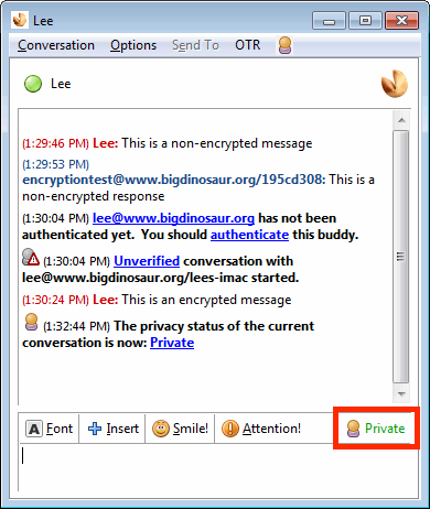 The encrypted session was invoked by pressing the OTR button (highlighted with the red box), which changes state depending on the encryption state of the conversation. It will say “Not Private” if the chat is unencrypted, “Unverified” if the chat is encrypted but you’ve not yet verified the identity of the person with whom you’re speaking, and “Private” (as in the screenshot) if you’ve positively identified your chat partner.