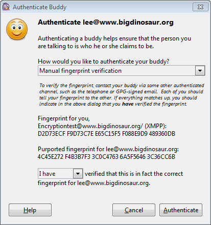 Identification is typically done by key fingerprint verification. There are lots of places to read about how public key fingerprints work, so I won’t rehash them in depth here, except to say that it’s always best to verify the public key fingerprint of the person with whom you’re chatting by using an out-of-band method—for example, the very first time you’re going to have an encrypted chat with someone, call them on the phone and have them read off their public key fingerprint, and you read off yours. When you begin the chat, your IM client will ask you to validate their key fingerprint in order to ensure that the person with whom you’re chatting is actually for-real the person you believe them to be: