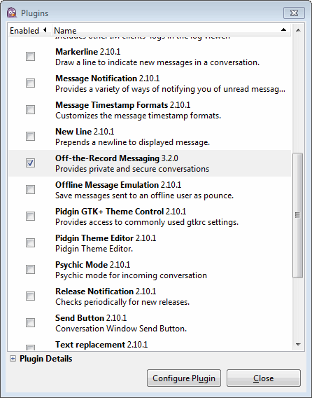Once the OTR messaging plug-in is installed, you’ll need to enable it. Press ctrl-u to invoke the Pidgin plugins menu, and make sure “Off-the-Record Messaging” is checked: