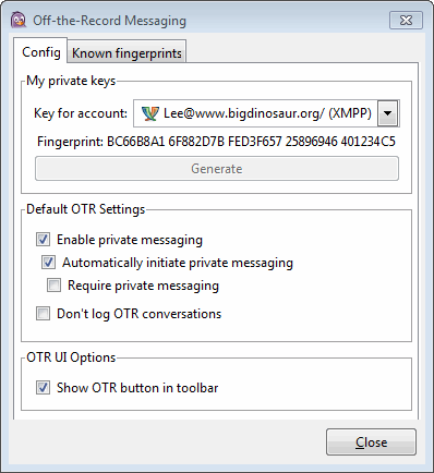 You don’t need to generate a private key, as the system will do that for you the first time you initiate an encrypted chat (though you can generate one now if you really want). The other options here can be set to taste, but make sure to at least check “Enable private messaging”. You can also check “Automatically initiate private messaging” to have Pidgin attempt to start all chats encrypted, and “Require private messaging” to cause Pidgin to reject all non-encrypted communication.