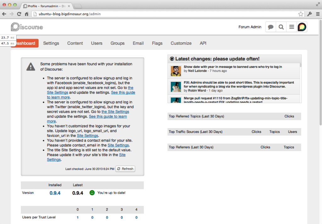 This was a long-ass post! From here, you’ll want to do some basic setup and maintenance on your forum: change the admin user name and password, obviously, and update the graphics with your own. Then, visit other Discourse forums to see how others have things configured! Mine is here, but probably the most important one on the web is the Discourse Meta forum, where the developers can be found. There’s also the new BoingBoing BBS, which just shifted over to Discourse. A mostly-current list of Discourse forums can be found in this thread on Meta.