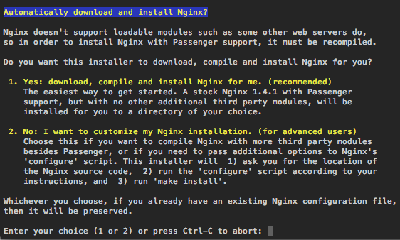 The Passenger guys have done an excellent job in making the compiling process as easy as possible, but we need to be able to step in and customize things just a bit in order to preserve existing Nginx functionality. So, when the script prompts you on whether or not you want to automatically download and install Nginx, you’ll need to say no, by choosing option 2.