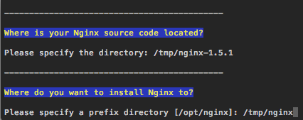 Next, the script will ask where you’d like to install Nginx to. For now, enter /tmp/nginx as the location. We’ll manually stop Nginx and copy over the new binary after the Passenger script stops.