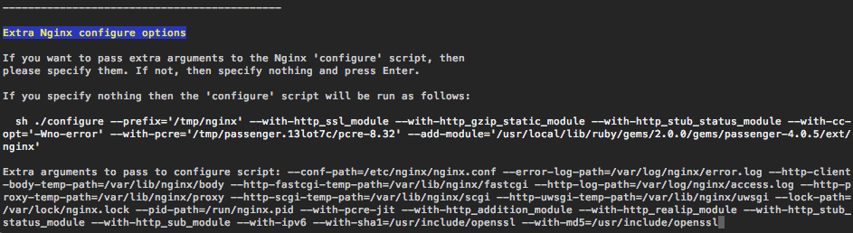 Then, hit enter a couple of times and let it run. The script will compile an Nginx binary and place it at /tmp/nginx/sbin/. When the script is finished, it will display some instructions on what configuration file options to twiddle in order to enable Passenger support for Nginx; we’ll enter those shortly.