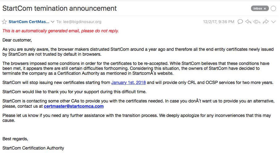 The last service I had still using my old StartSSL wildcard certificate was BigDinosaur.org’s email, and immediately prior to penning this blog post I cut that over to Let’s Encrypt, too.