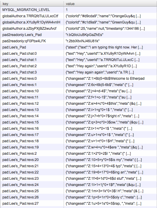 Etherpad Lite uses keys and values to track everything. When it’s told to use MySQL as its backend store, it creates one giant table with a “key” column and a “value” column, and stores everything there. Looks like this: