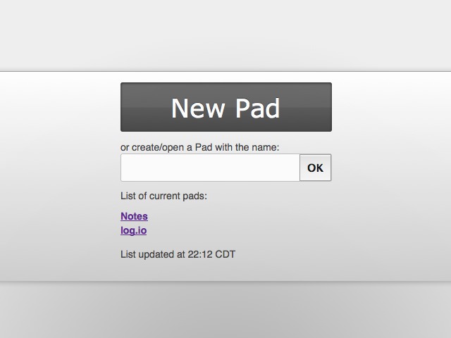 At this point, Etherpad Lite is fully functional and working, and you could easily stop here and call the project done. However, although it’s obviously very easy to jump in and start creating documents, and easy to share those documents once you’re editing them, there’s no quick and easy way to get Etherpad Lite to display a list of all the existing pads. And wouldn’t it be cool if the elements in that list were hyperlinked to the live pads?